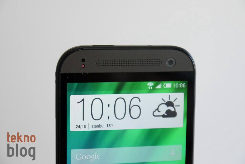 HTC One mini 2’nin 4.5 inç ekranının altında ve üstünde BoomSound hoparlörlerin yer aldığını görüyoruz. Karşıdan bakıldığında, BoomSound hoparlörün solunda sensörler, sağında da 5 megapiksel ön kamera yer alıyor. Ekranın altında sadece HTC logosunu görüyoruz, HTC One (M8)’de navigasyon kontrolleri artık ekran içinden sağlandığı için fiziksel tuşlara gerek kalmamıştı, aynı durum HTC One mini 2’de de sürdürülüyor.